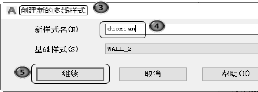 在“创建新的多线样式”对话框的“新样式名”文本框中输入“duoxian”,