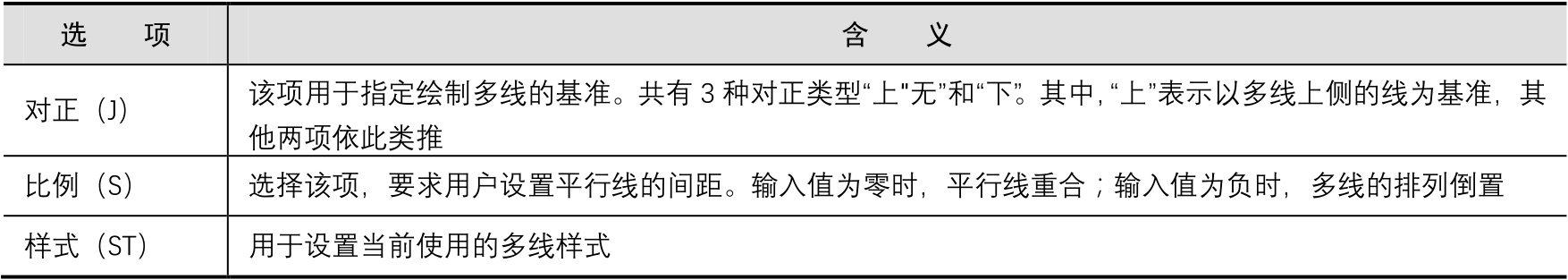 利用该对话框,可以创建或修改多线的模式。对话框中分4列显示示例图形。其中,第一列管理十字交叉形多线,第二列管理T形多线,第三列管理拐角接合点和节点,第四列管理多线被剪切或连接的形式。