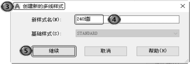 (5)定义120多线样式。选择菜单栏中的“格式”→“多线样式”命令,系统打开“多线样式”对话框。单击“新建”按钮,系统打开“创建新的多线样式”对话框,在该对话框的“新样式名”文本框中输入“120墙”,单击“继续”按钮。