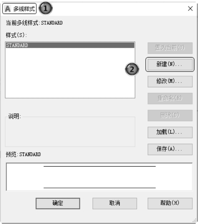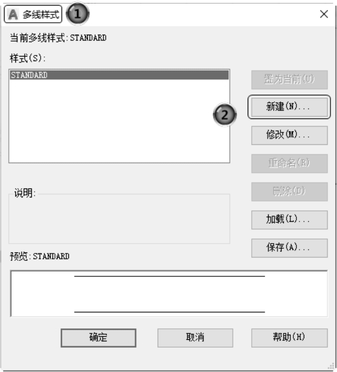 单击“确定”按钮,返回到如图3-60所示的“多线样式”对话框。在“样式”列表中会显示刚设置的多线样式名,选择该样式,单击“置为当前”按钮,则将刚设置的多线样式设置为当前样式,下面的预览框中会显示所选的多线样式。