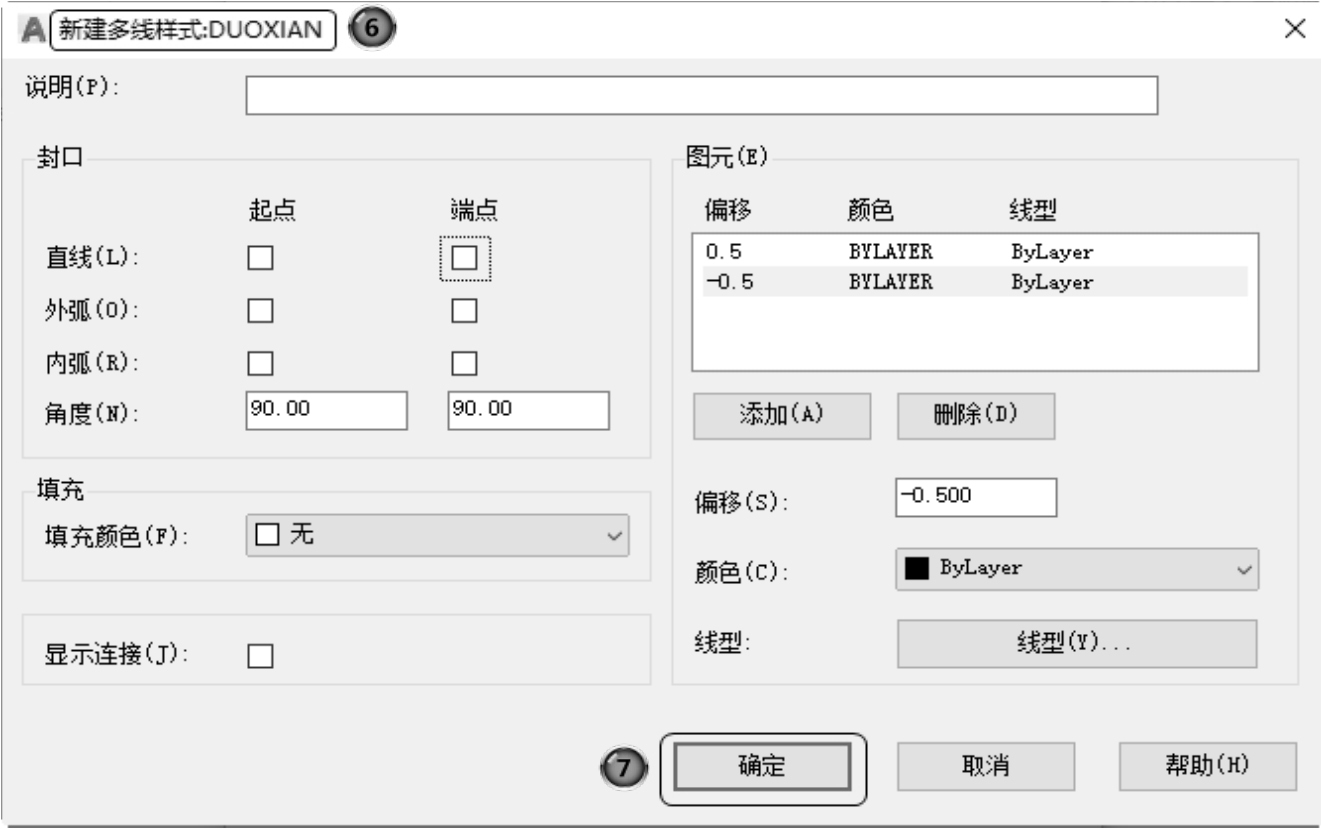(4)在“封口”选项组中可以设置多线起点和端点的特性,包括直线、外弧还是内弧封口及封口线段或圆弧的角度。