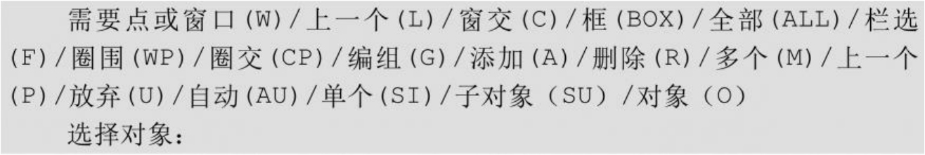 等待用户以某种方式选择对象作为回答。AutoCAD 2022提供多种选择方式,可以输入“?”,查看这些选择方式。选择选项后,出现如下提示。