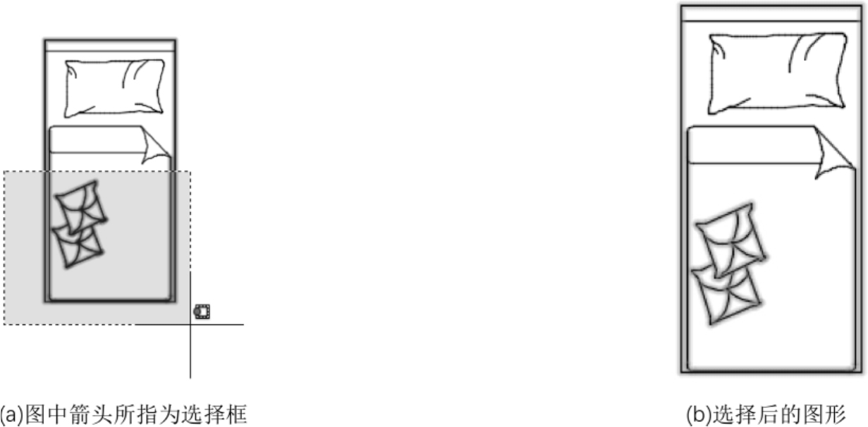 (5)框(BOX):使用框时,系统根据用户在绘图区指定的两个对角点的位置而自动引用“窗口”或“窗交”选择方式。若从左向右指定对角点,则为“窗口”方式;反之,则为“窗交”方式。