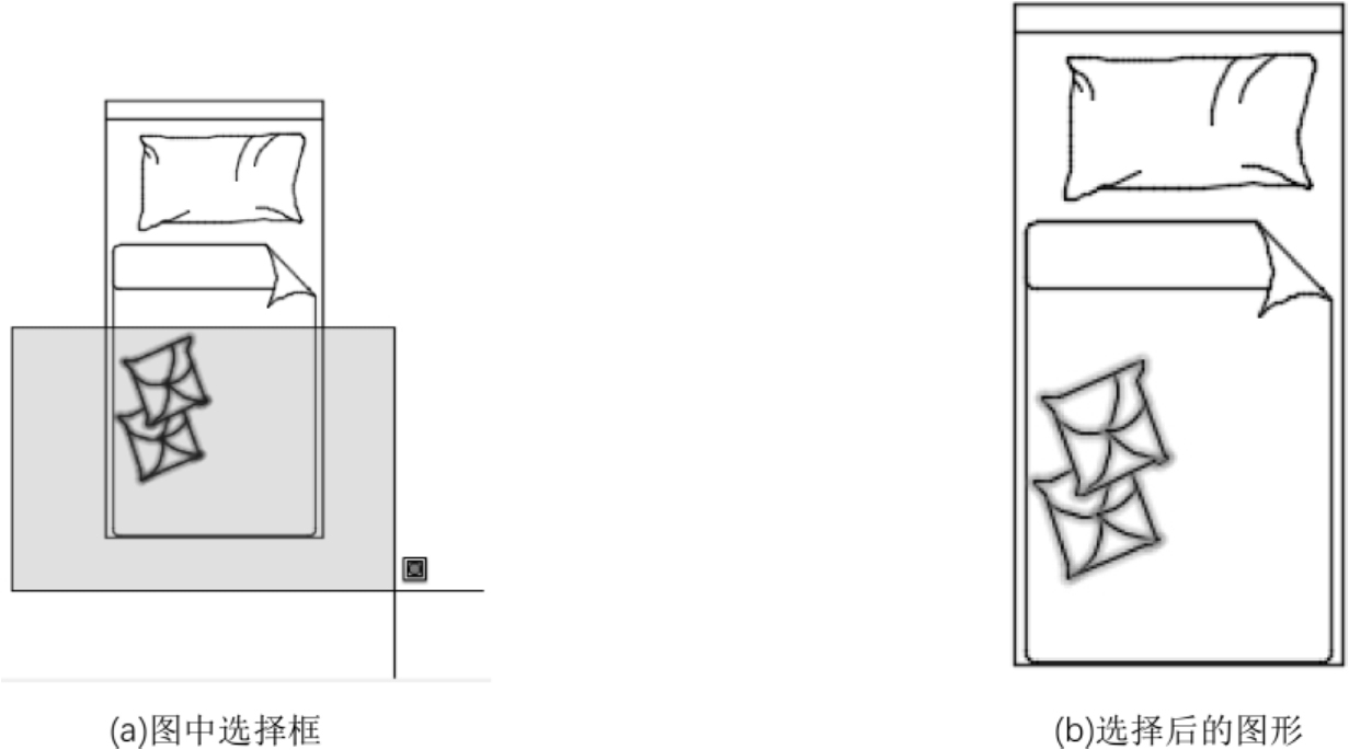 (4)窗交(C):该方式与“窗口”方式类似,其区别在于它不但选中矩形窗口内部的对象,也选中与矩形窗口边界相交的对象,执行结果如图4-2所示。