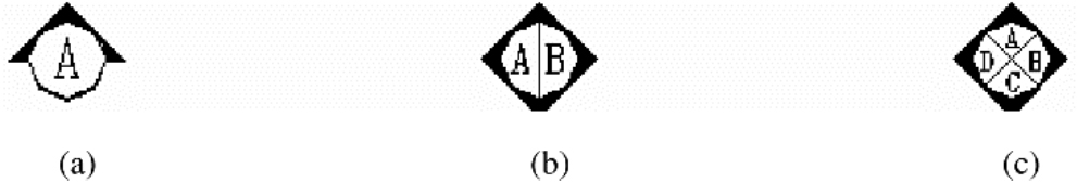 在房屋建筑中,一个特定的室内空间领域总存在竖向分隔(隔断或墙体)来界定。因此,根据具体情况,就存在绘制1个或多个立面图来表达隔断、墙体及家具、构配件的设计情况。内视符号标注在平面图中,包含视点位置、方向和编号三个信息,建立平面图和室内立面图之间的联系。内视符号的形式如图1-17所示,图中立面图编号可用英文字母或阿拉伯数字表示,黑色的箭头指向表示立面的方向。图1-17(a)为单向内视符号,图1-17(b)为双向内视符号,图1-17(c)为四向内视符号,A、B、C、D顺时针标注。