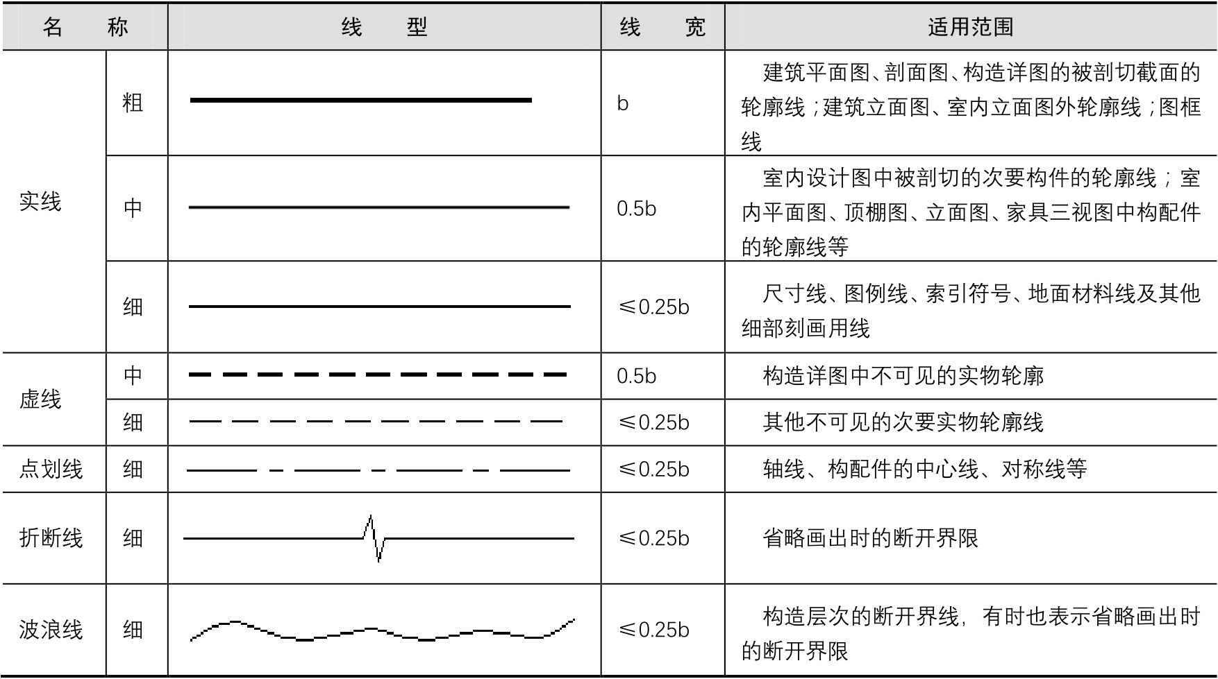 注意:标准实线宽度b=0.4~0.8mm。