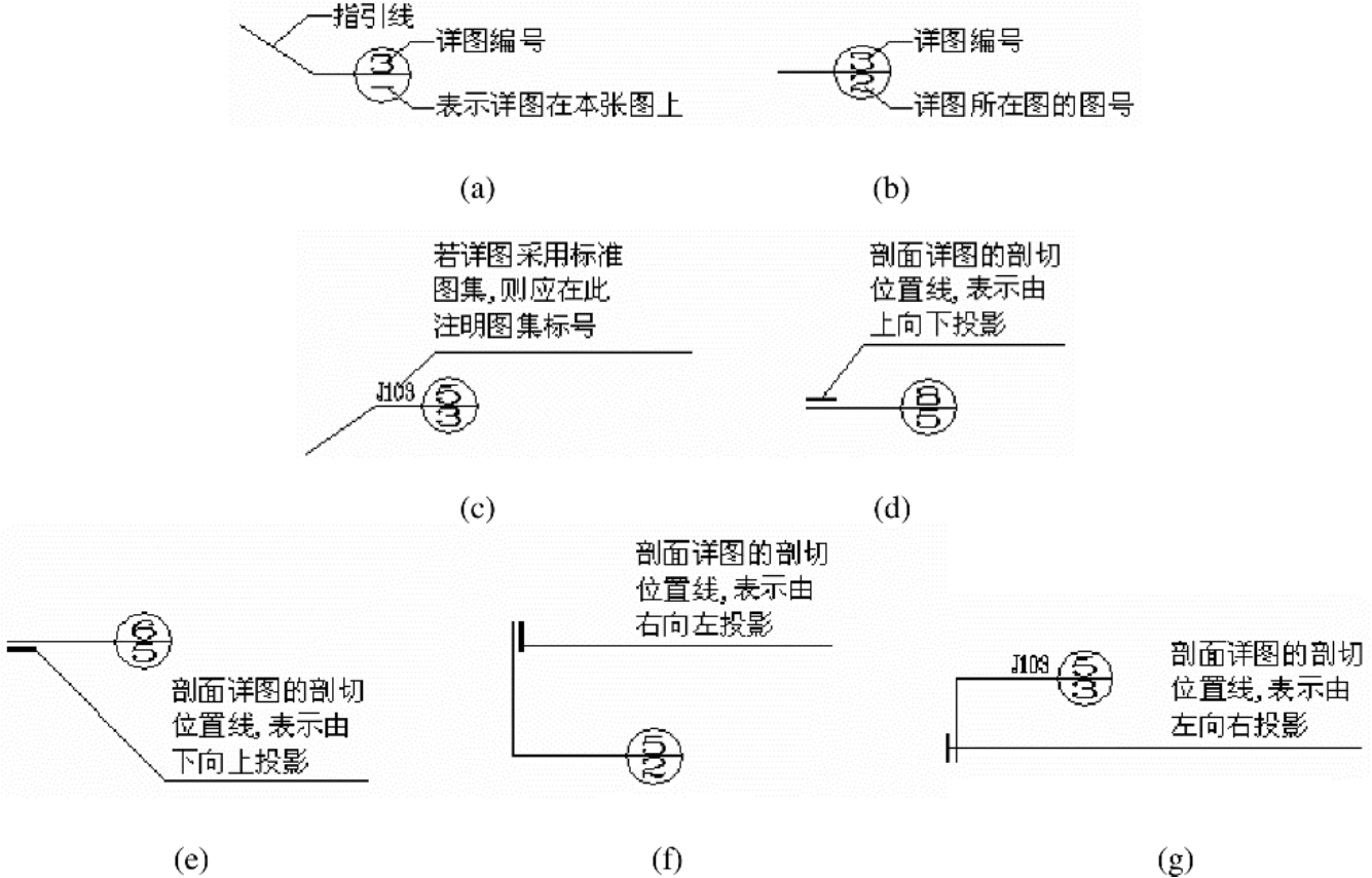 室内平面图、立面图、剖面图中,在需要另设详图表示的部位,标注一个索引符号,以表明该详图的位置,这个索引符号就是详图索引符号。详图索引符号采用细实线绘制,圆圈直径为10mm。如图1-14所示,图中(d)、(e)、(f)、(g)用于索引剖面详图,当详图就在本张图纸中时,采用如图1-14(a)所示的形式,详图不在本张图纸中时,采用如图1-14(b)、(c)、(d)、(e)、(f)、(g)所示的形式。