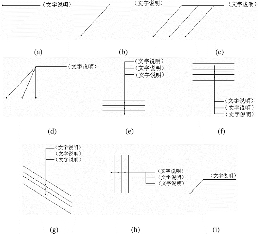 由图纸引出一条或多条线段指向文字说明,该线段就是引出线。引出线与水平方向的夹角一般采用0°、30°、45°、60°或90°,常见的引出线形式如图1-16所示。图1-16(a)~(d)为普通引出线,图1-16(e)~(h)为多层构造引出线。使用多层构造引出线时,应注意构造分层的顺序要与文字说明的分层顺序一致。文字说明可以放在引出线的端头,如图1-16(a)~(h)所示;也可放在引出线水平段之上,如图1-16(i)所示。