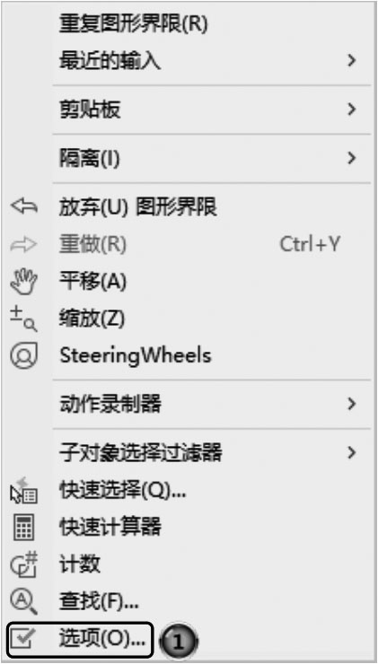 打开“选项”对话框。用户可以在该对话框中设置有关选项,对绘图系统进行配置。下面就其中主要的两个选项卡做一下说明,其他配置选项,在后面用到时再做具体说明。