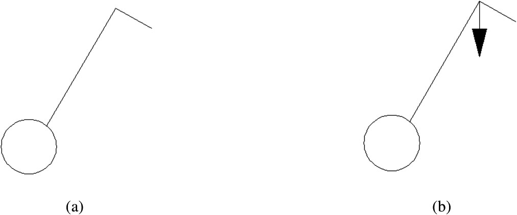 ,用鼠标捕捉圆右上角一点作为起点,绘制长度为5mm,且与水平方向成60º角的斜线1,并以斜线1的终点为起点,绘制长度为1.5mm,与斜线成90º角的斜线2,如图3-39(a)所示。