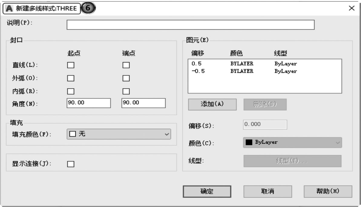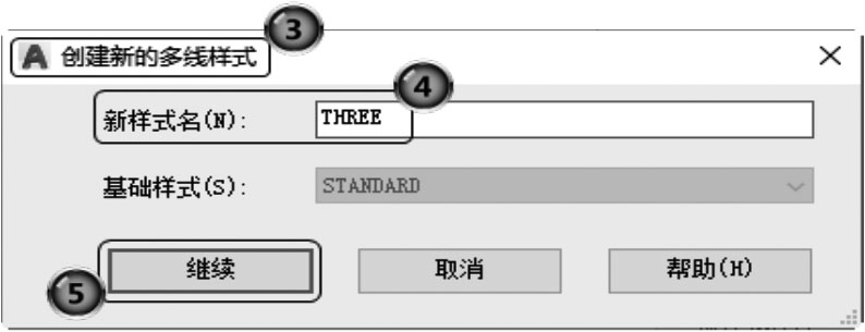 在“创建新的多线样式”对话框的“新样式名”文本框中输入“THREE”,