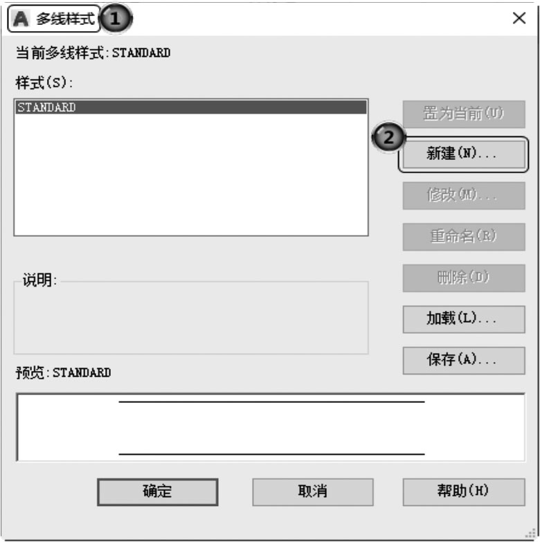 (7)设置完毕后,单击“确定”按钮,返回到如图3-46所示的“多线样式”对话框。在“样式”列表中会显示刚设置的多线样式名,选择该样式,单击“置为当前”按钮,则将刚设置的多线样式设置为当前样式,下面的预览框中会显示所选的多线样式。