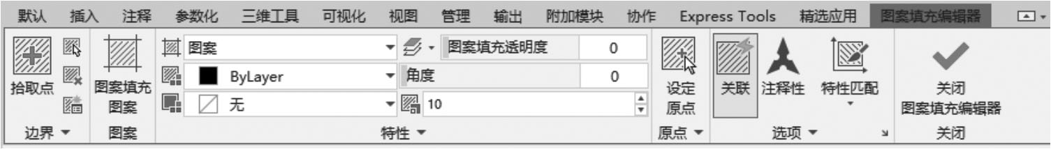 功能区:单击“默认”选项卡“绘图”面板中的“图案填充”按钮