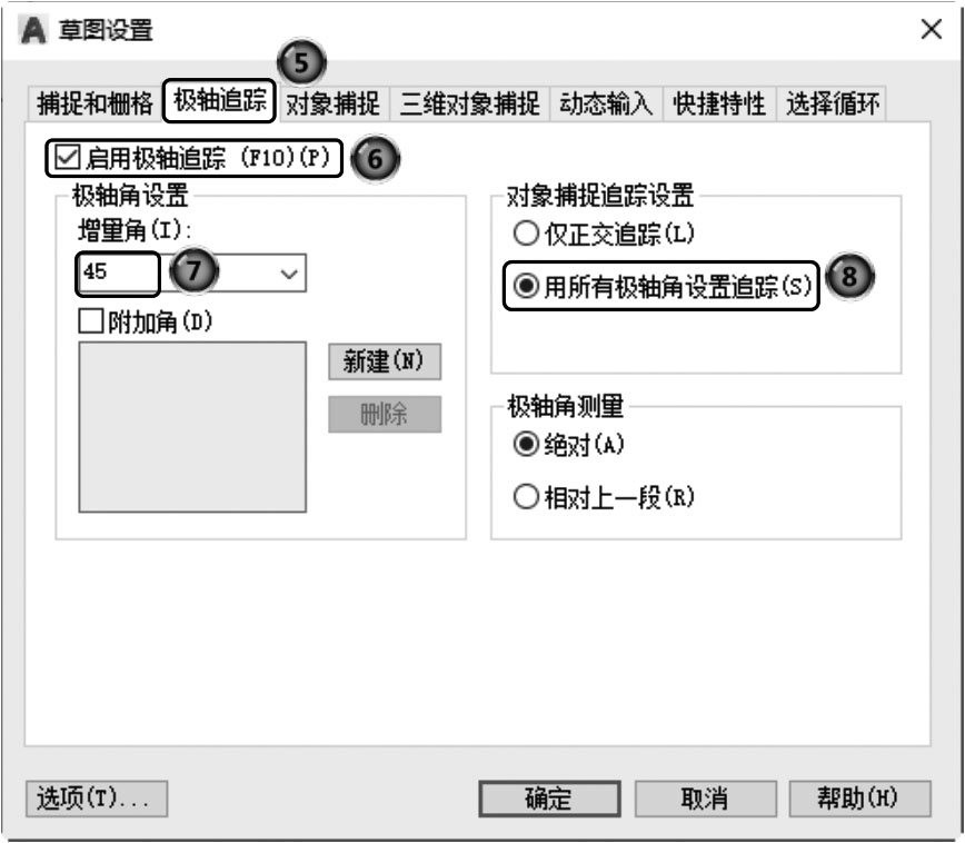 选用“启用极轴追踪”复选框,在“增量角”下拉列表中
