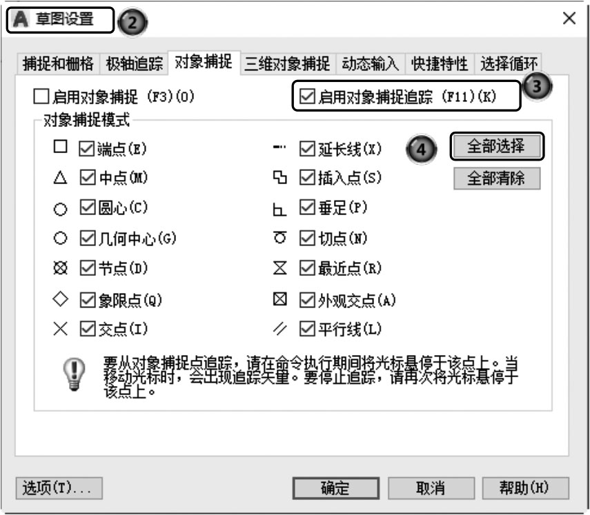 单击“全部选择”按钮,将所有特殊位置点设置为可捕捉状态,如图3-73所示。
