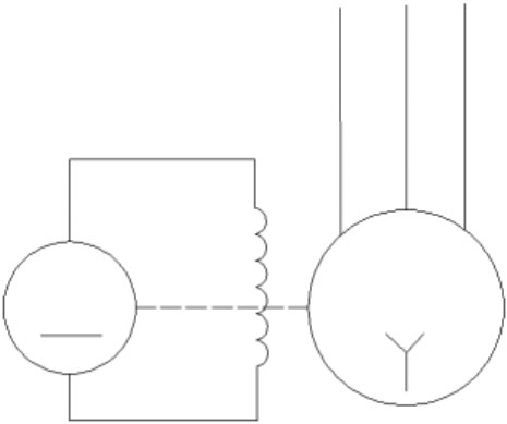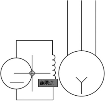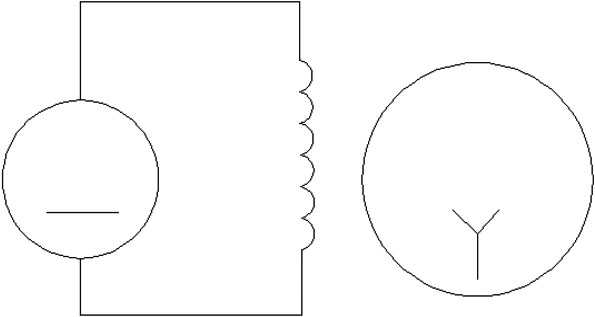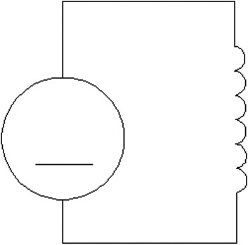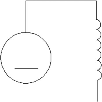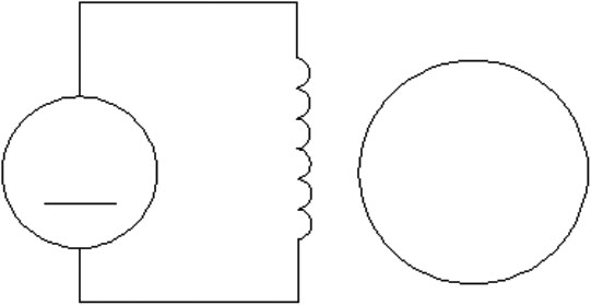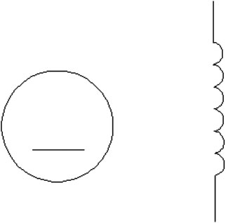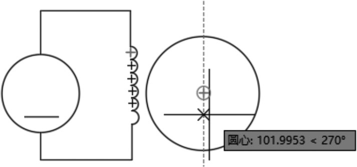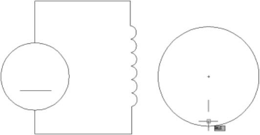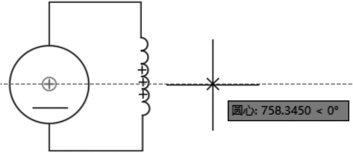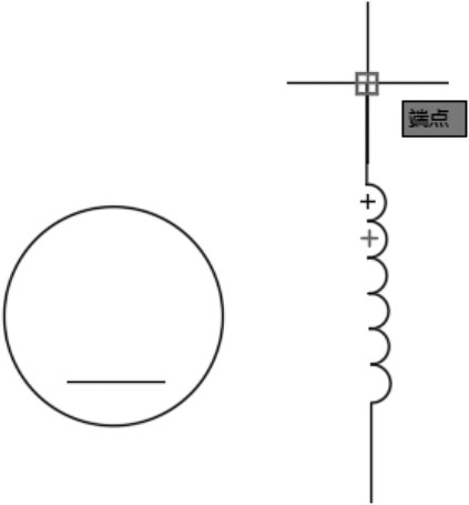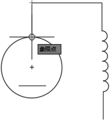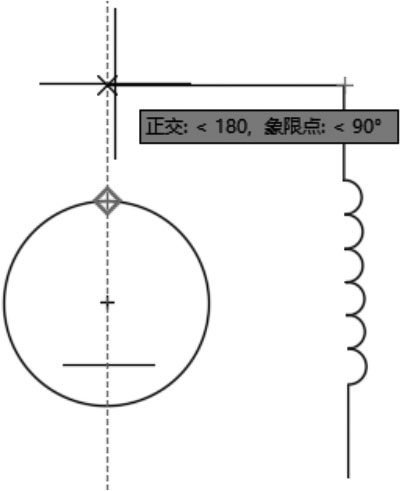 ,将鼠标移向表示电感的多段线顶端,系统自动捕捉该端点为直线起点,单击鼠标左键确认,如图3-75所示。继续移动鼠标指向左边圆,捕捉到圆的圆心或象限点,向上移动鼠标,这时显示对象捕捉追踪虚线和水平线垂直交点,如图3-76所示,在显示的交点处单击鼠标左键确认,完成水平线段绘制,继续向下移动鼠标,捕捉圆的上象限点,如图3-77所示,单击鼠标左键确认,最后回车,结果如图3-78所示。