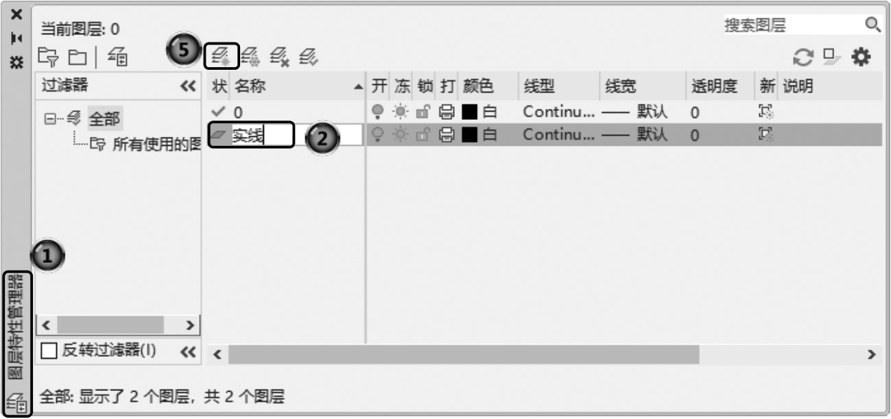 打开“图层特性管理器”对话框,创建一个新的图层,把该层的名字由默认的“图层1”
