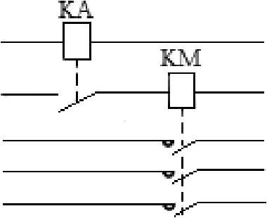 把设备或成套装置中一个项目各组成部分的图形符号在简图上绘制在一起的方法,称为集中表示法。在集中表示法中,各组成部分用机械连接线(虚线)互相连接起来,连接线必须是一条直线。可见这种表示法只适用于简单的电路图。如图1-29所示是两个项目,继电器KA有一个线圈和一对触点,接触器KM有一个线圈和三对触头,它们分别用机械连接线联系起来构成一体。