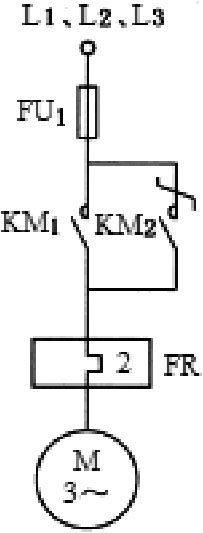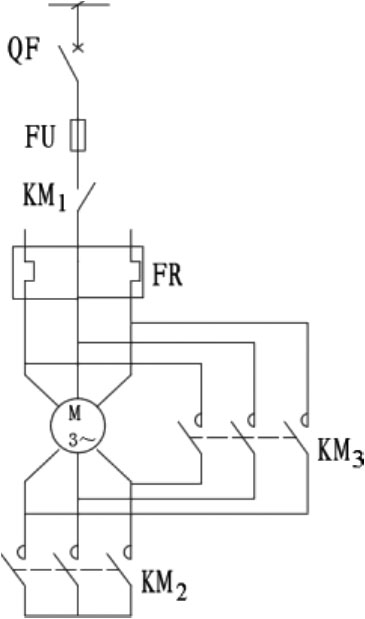 在一个图中,一部分采用单线表示法,另一部分采用多线表示法,称为混合表示法,如图1-28所示。为了表示三相绕组的连接情况,该图用了多线表示法;为了说明两相热继电器,也用了多线表示法;其余的断路器QF、熔断器FU、接触器KM1都是三相对称的,采用单线表示。这种表示法既有单线表示法简洁精练的优点,又有多线表示法描述精确、充分的忧点。