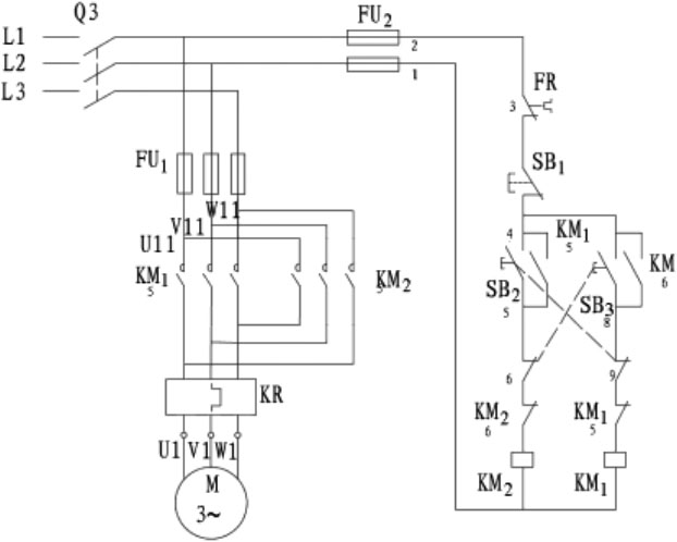 在电气图中,电气设备的每根连接线或导线各用一条图线表示的方法,称为多线表示法。如图1-26所示为一个具有正、反转功能的电动机主电路,多线表示法能比较清楚地表示电路工作原理,但图线太多,对于比较复杂的设备,交叉就多,反而有阻碍看懂图。多线表示法一般用于表示各相或各线内容不对称和要详细表示各相和各线的具体连接方法的场合。