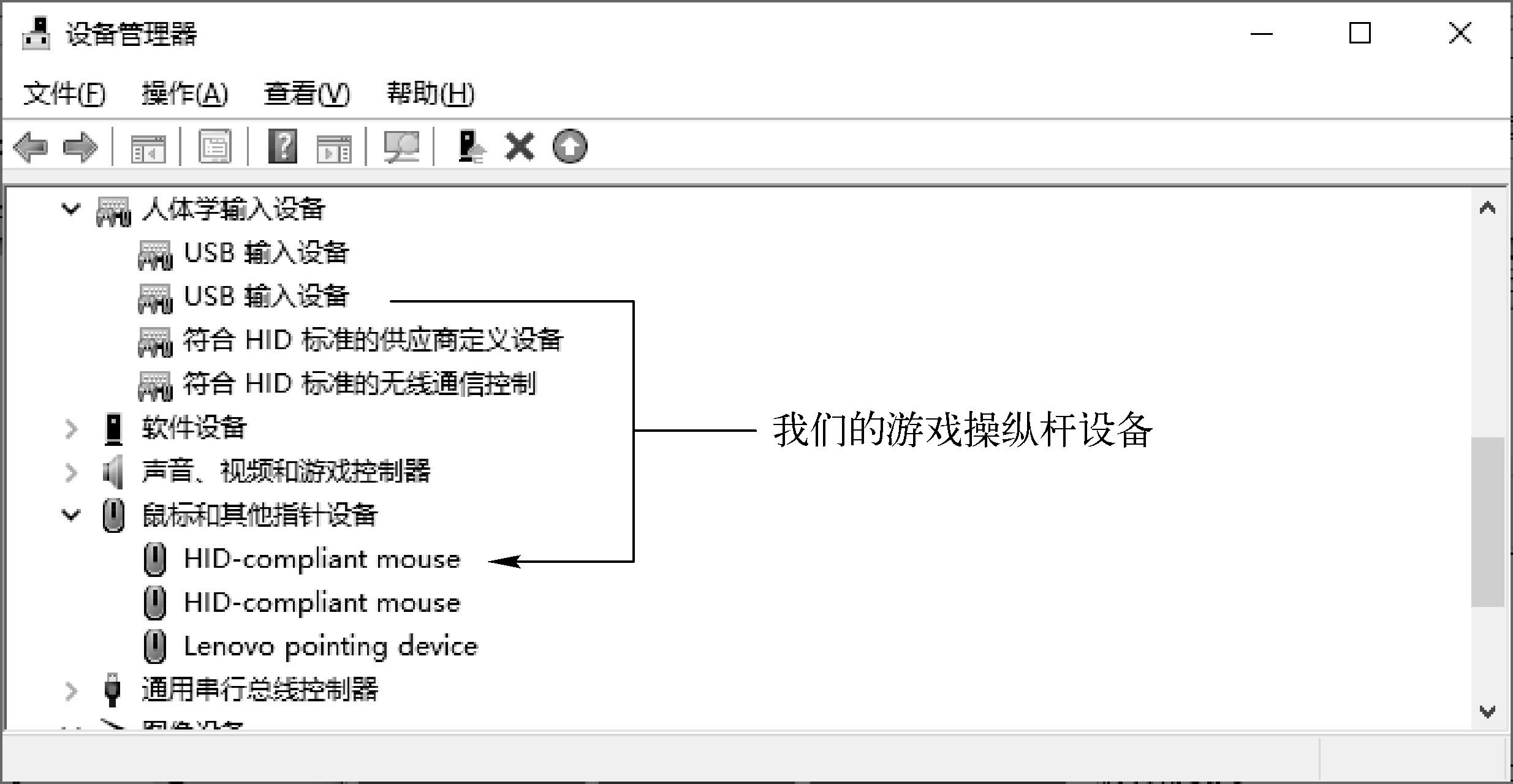 进入Windows 10操作系统的“设备管理器”,在“鼠标和其他指针设备”与“人体学输入设备”项分别会出现“HID-compliant mouse”与“USB输入设备”项,这对应我们的游戏操作杆设备,如图8.8所示。