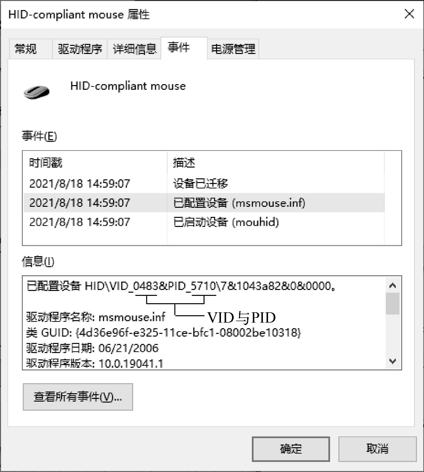 有人可能想问:好像有两个“HID-compliant mouse”项,你怎么确定哪项对应刚刚连接的游戏操纵杆设备?我们可以通过查看设备的厂商标识符(Vendor Identifier, VID)与产品标识符(Product Identifier, PID)来确定。双击图8.8所示“HID-compliant mouse”项即可弹出如图8.9所示的“HID-compliant mouse属性”对话框,在“事件”标签页的“信息”框中可以查到相应的VID与PID分别为“0483”与“5710”,这正是我们的设备(至于为什么是这两个标识符,后续在了解USB规范后就会很容易理解,此处暂且不提)。