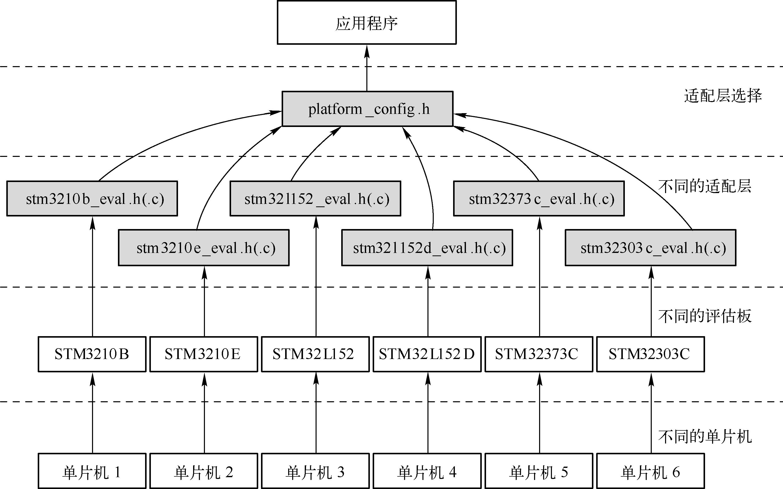 为解决评估板资源分配差异带来的问题,我们可以给每个评估板单独发布固件库,每个固件库都针对相应的评估板进行了引脚的适配操作,但是这并不利于源代码的管理,所以我们也可以这么做: 在应用层与硬件层之间增加适配层,其针对不同的评估板进行各种引脚资源的适配 。当针对不同的STM32单片机系列进行编译时,我们仅需要切换适配层即可,而应用程序都是完全一样的。也就是说,图8.2所示的例程可以适配包含STM3210B-EVAL(评估板的名称)在内的6种评估板,图8.3清晰展示了适配层存在的意义。