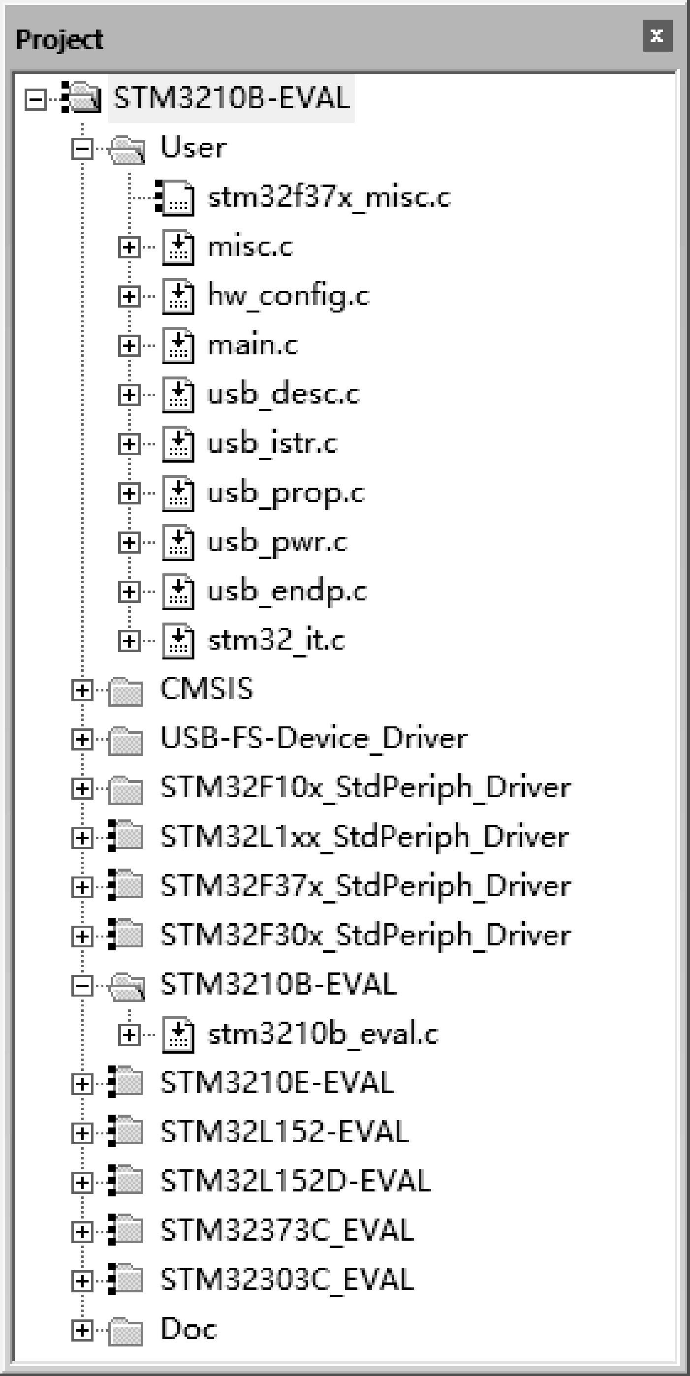 首先应该注意到,项目文件结构中包含了6个以字符串“EVAL”为后缀的组,它们是用来做什么的呢?我们知道,ST厂商开发了应用于不同场合的多个STM32单片机系列,在设计评估板时通常会选择其中某几款具有代表性的单片机型号,而不同评估板实现的功能通常是相同或相似的(没有必要给每个单片机型号设计完全不同的例程浪费资源)。但是由于单片机的型号不同,相应的引脚定义肯定不可避免会有一些差异。尽管厂商在设计多个评估板时会尽量进行引脚资源的统一规划,要做到完全一致仍是不太可能的,这就会导致相同的应用程序不能在另一个平台直接使用。例如,同样是STM32F103x系列单片机,LQFP100封装芯片有PE2、PE3、PD2、PD3等引脚,但这些引脚在LQFP48封装芯片中却不存在。