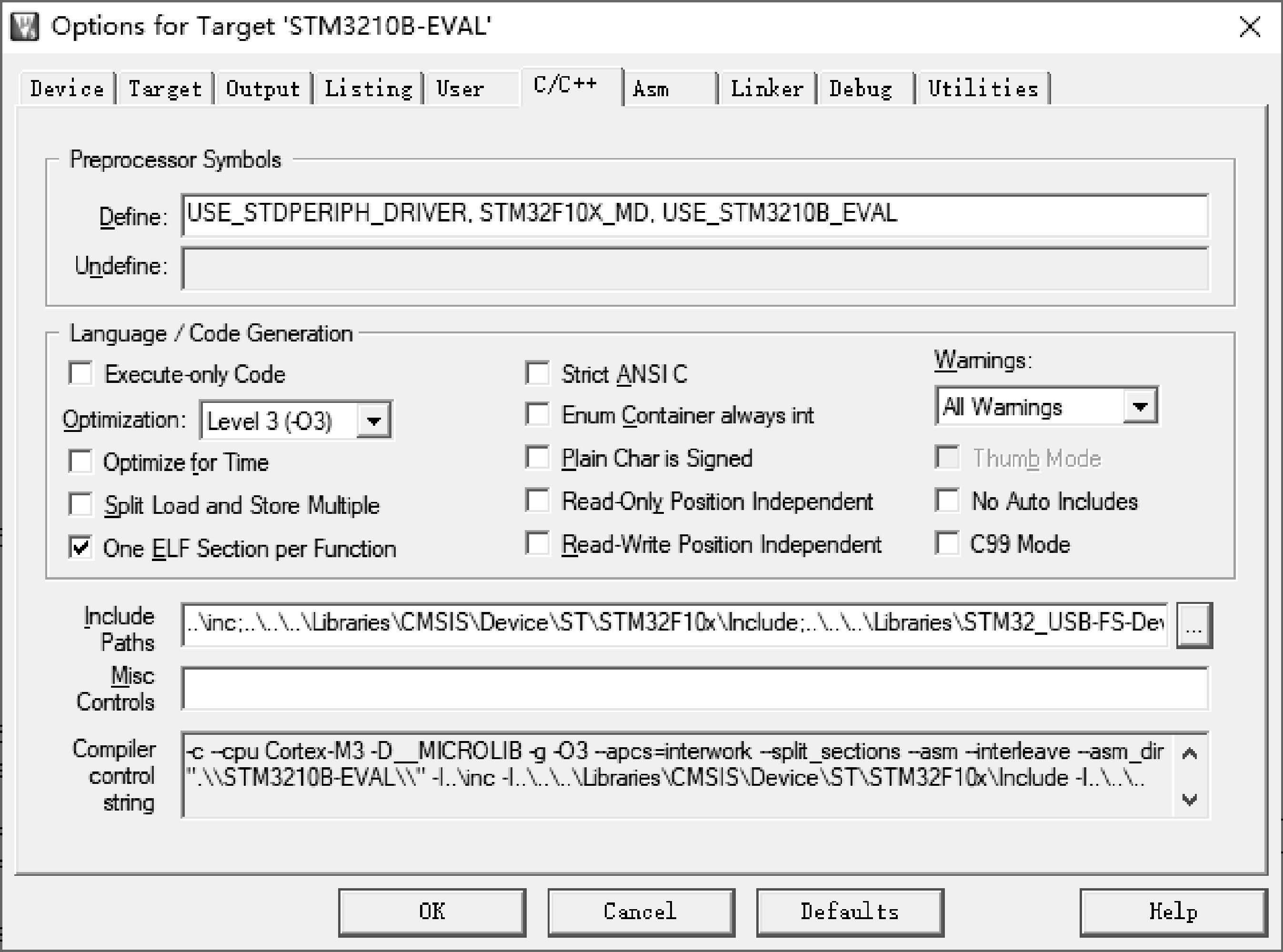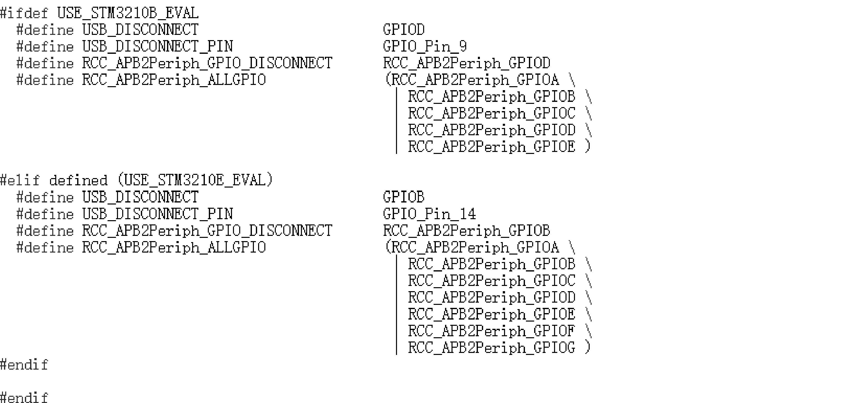 platform_config.h头文件表达的意思很简单,首先判断当前的单片机芯片属于哪个系列,然后根据评估板的不同选择相应的适配层,如果没有选择适配层,则默认使用STM32303C_EVAL。例如,对于STM32F103C8T6单片机,我们已经知道需要为它定义宏STM32F10X_MD,如果需要进一步使用STM3210B_EVAL适配层,就必须再定义一个宏USE_STM3210B_EVAL,这样才会包含相应的stm3210b_eval.h头文件。我们可以观察一下JoyStickMouse例程中的宏定义,如图8.4所示。