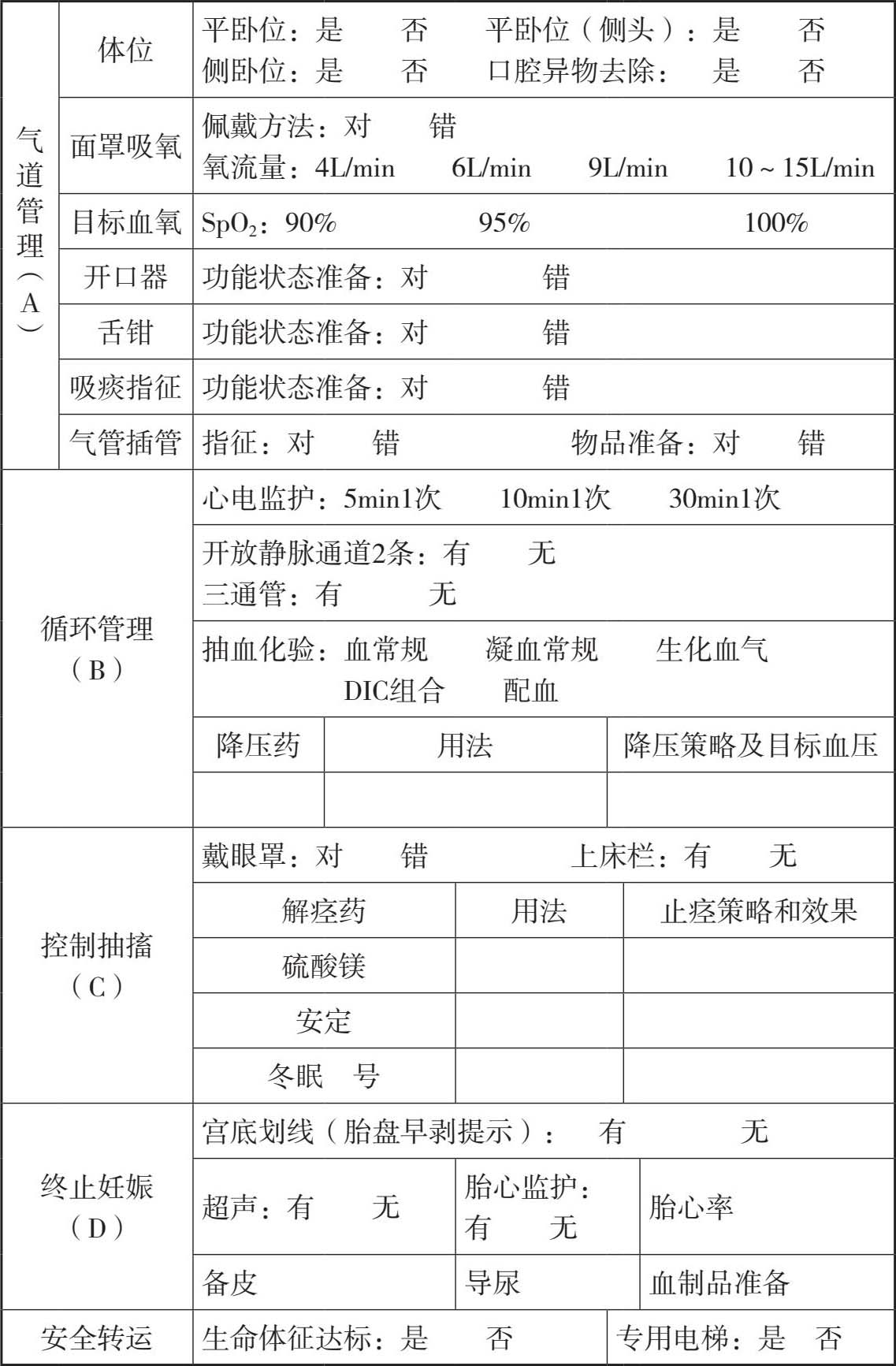 记录: 时间(团队人员通知及到达时间、抽搐持续时间、各项处理开始时间,各项处理达到目标时间),转出时生命体征情况。