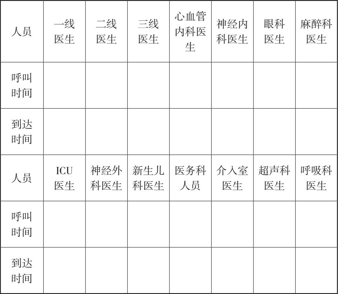 记录: 时间(团队人员通知及到达时间、抽搐持续时间、各项处理开始时间、各项处理达到目标时间),生命体征情况。