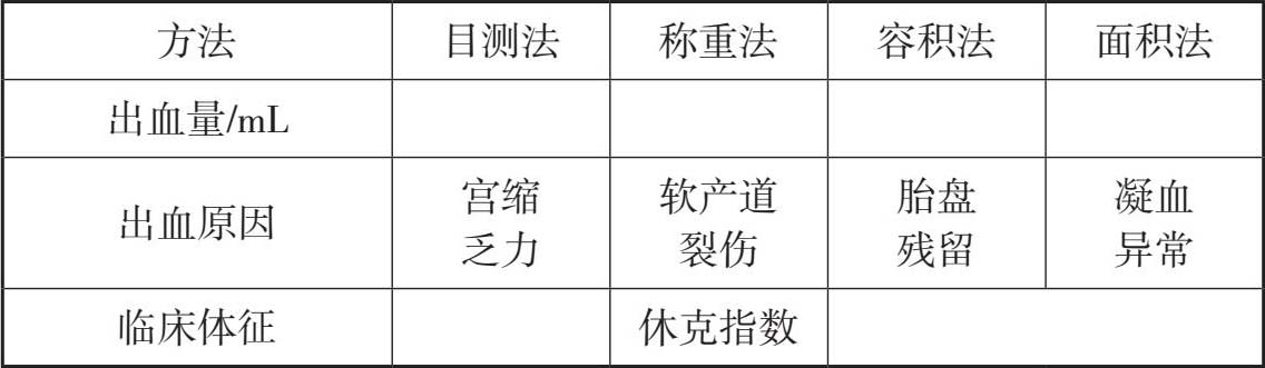 评估出血量: 面积法mL,容量法mL,称重法mL。