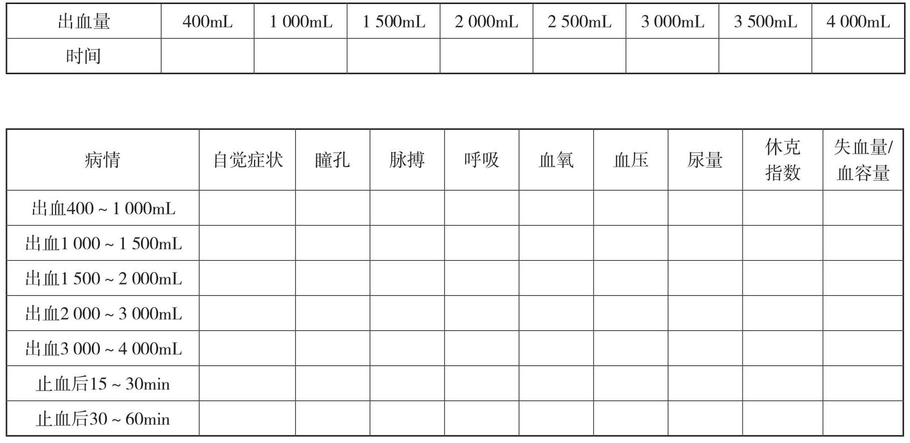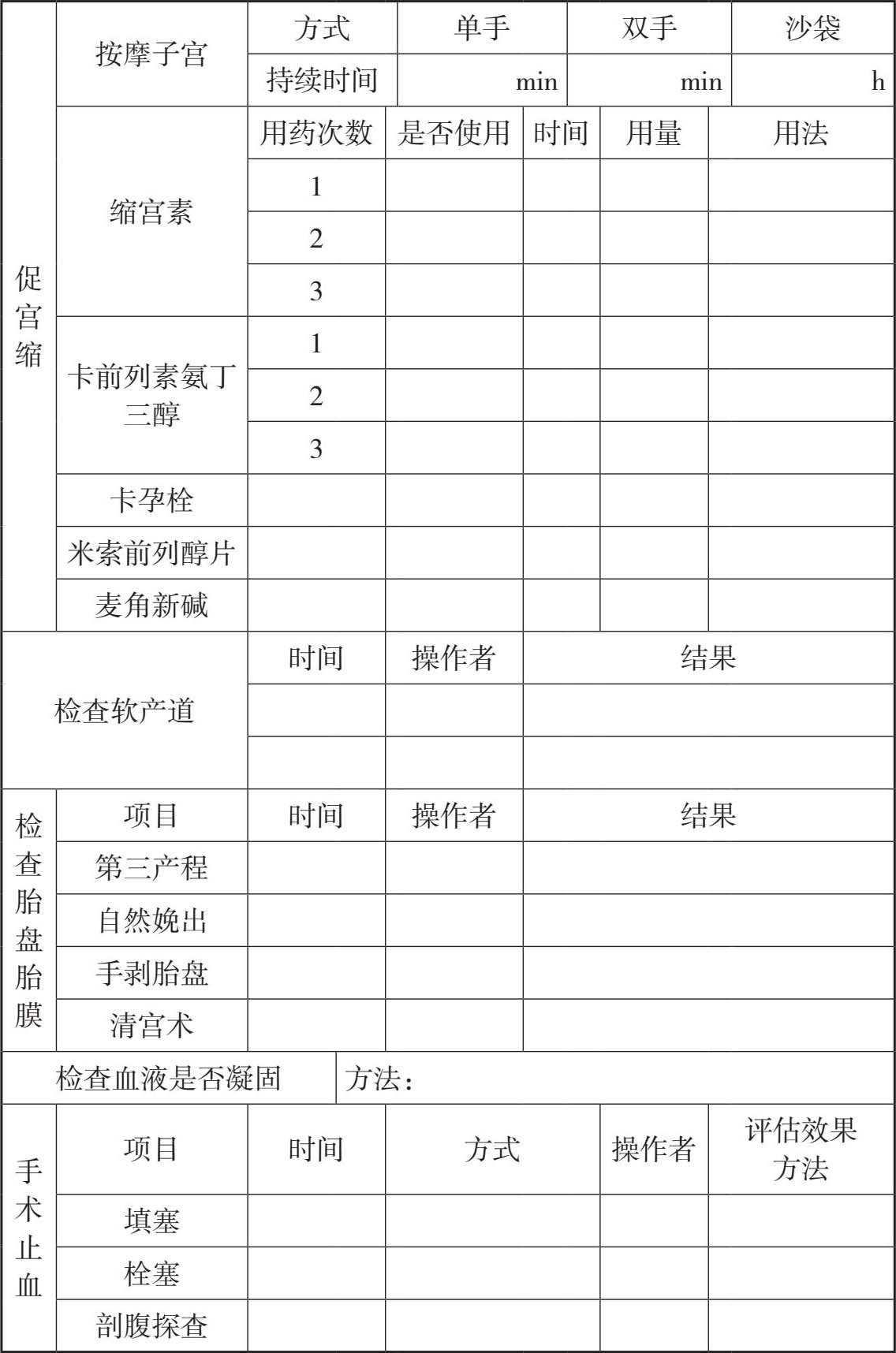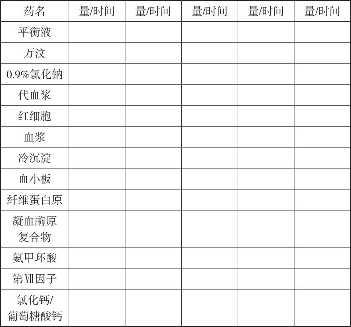 记录: 时间(团队人员通知及到达时间、出血时间、各项处理开始时间)、出血量、止血方式、补液量、生命体征。