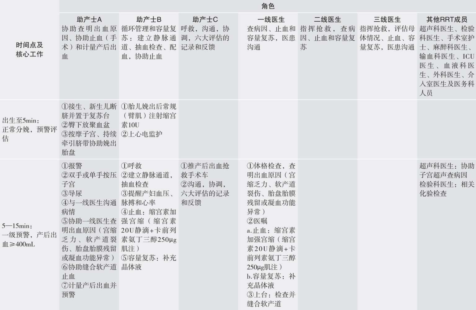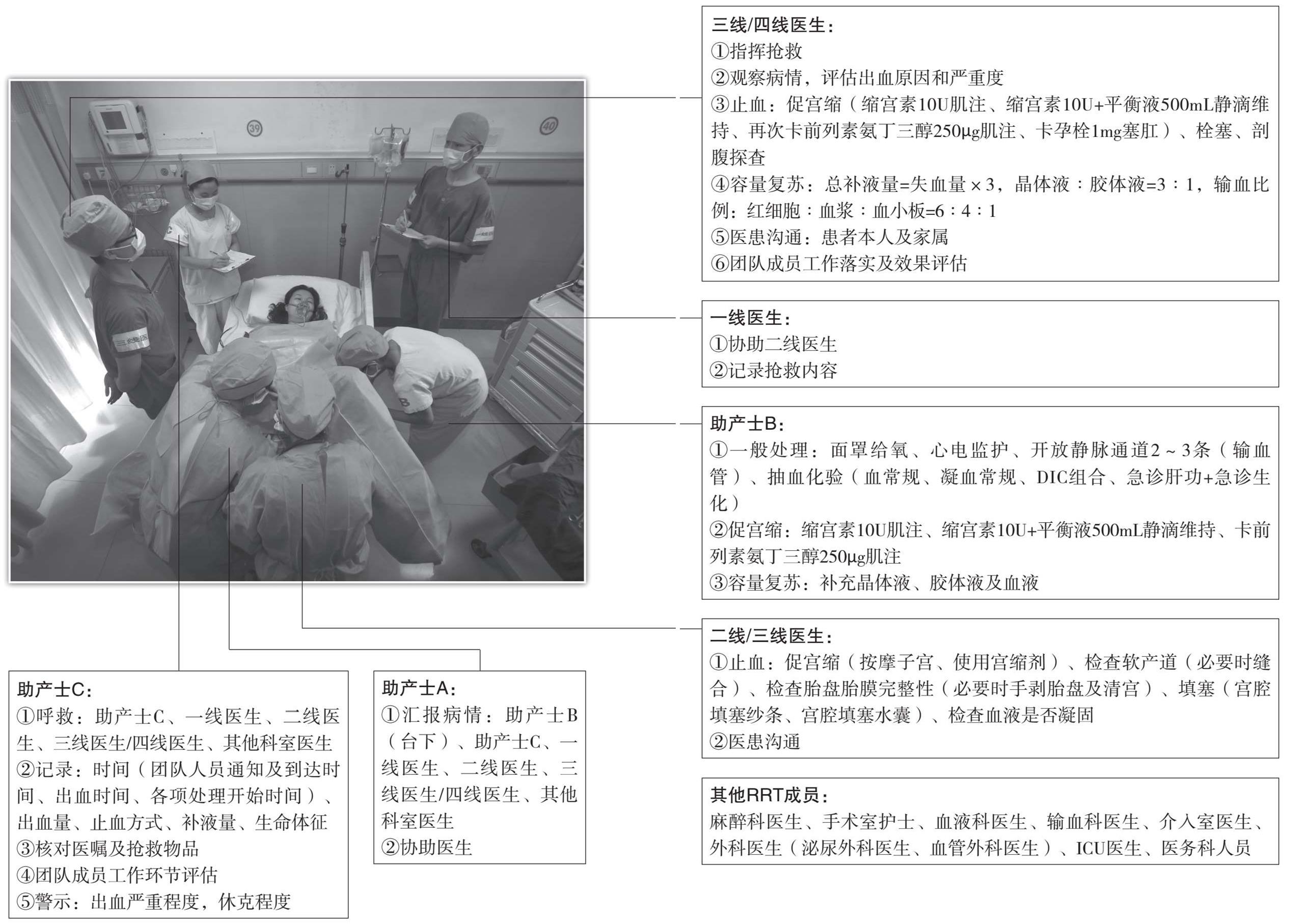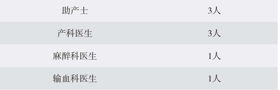 团队: 助产士A(台上)、助产士B(台下)、助产士C(台下)、医生A(一线)、医生B(二线)、检验科医生、超声科医生、麻醉科医生。