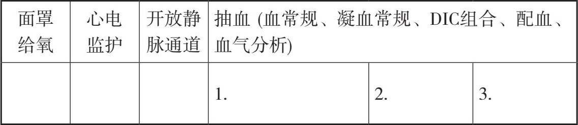 一般处理: 面罩给氧、心电监护、开放静脉通道2条、抽血化验(血常规、凝血常规、DIC组合、配血)。