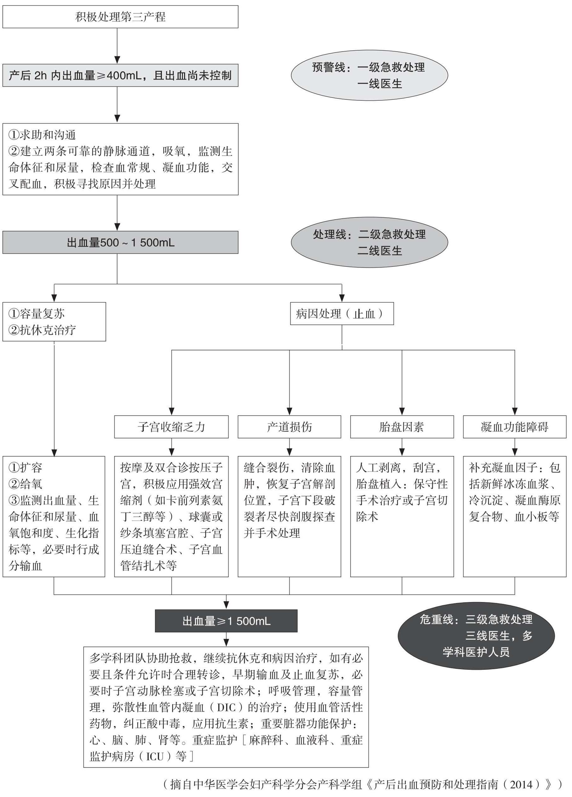 止血方式: 促宫缩(按摩子宫、缩宫素10U肌注、缩宫素10U+平衡液500mL静滴维持、卡前列素氨丁三醇250μg肌注)、检查软产道并缝合、检查胎盘胎膜完整性(必要时手剥胎盘或清宫)、检查血液是否凝固(必要时补充凝血因子)。