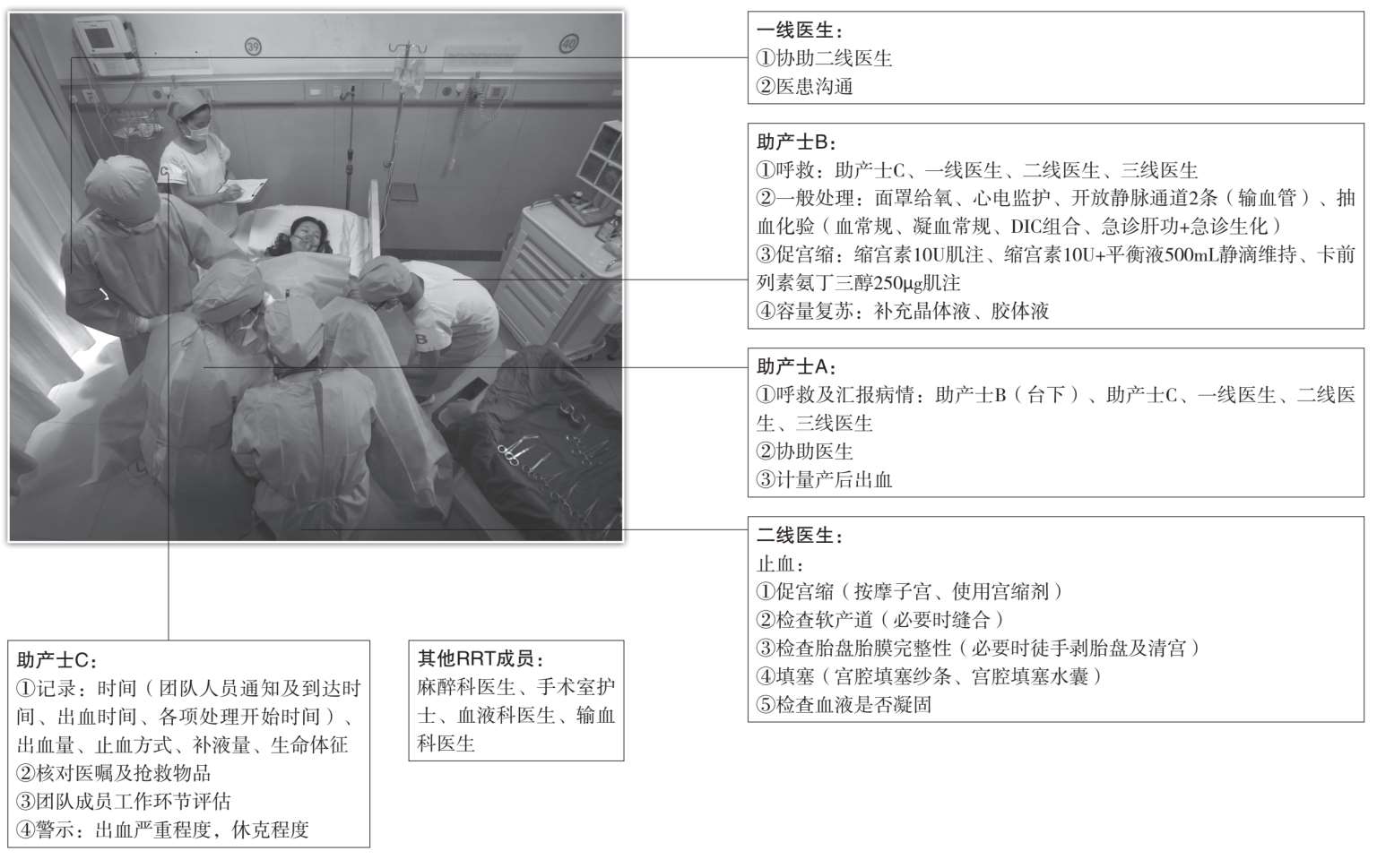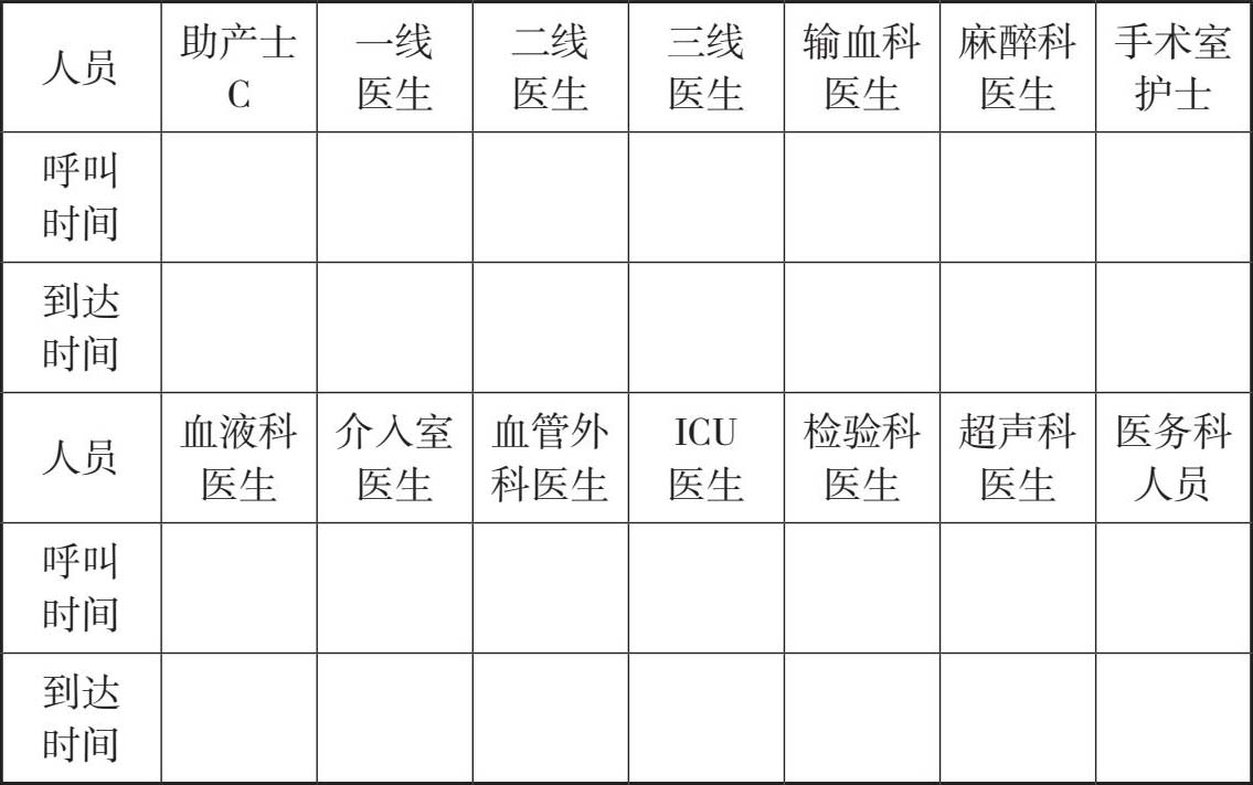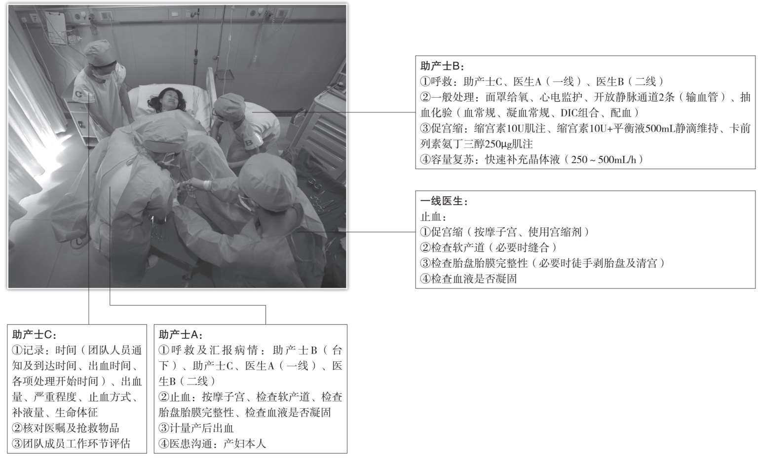 团队: 助产士A(台上)、助产士B(台下)、助产士C(台下)、医生A(一线)、医生B(二线)、检验科医生、超声科医生、麻醉科医生。