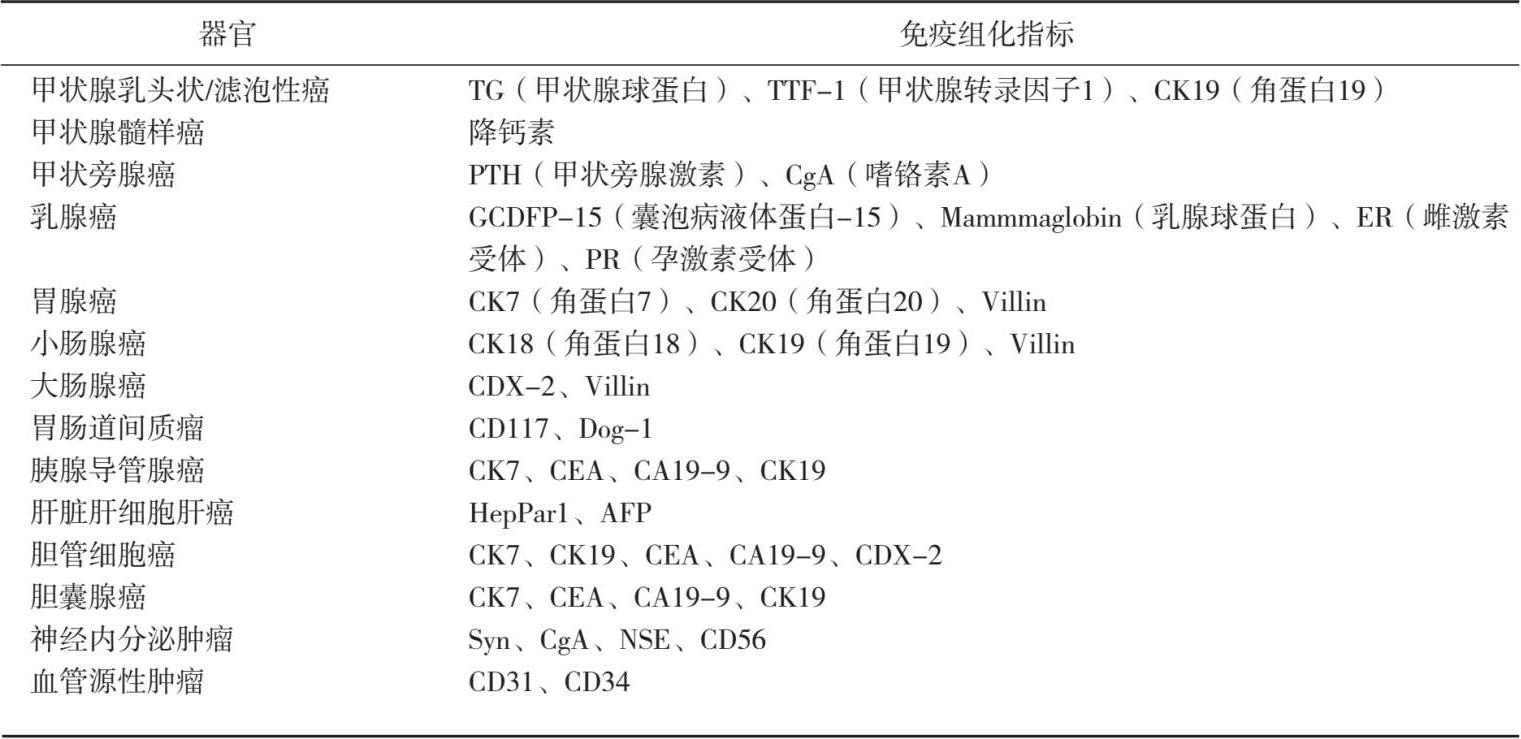 免疫组织化学(immunohistochemistry,IHC)是基于抗原-抗体相互识别,在光学显微镜的水平上利用抗体特异性结合,对组织或细胞内的特异性抗原进行定位的方法。自1940年免疫荧光技术的建立以来已有半个多世纪的历史,然而,直到20世纪90年代初才广泛应用于病理诊断,商业化的抗体以及免疫组化敏感的检测系统,对病理诊断特别是肿瘤的病理诊断带来了一场革命,影响是深远的。免疫组化技术辅助病理诊断和鉴别诊断,已成为基本的诊断模式,而某些肿瘤如果缺少免疫组化检测就无法获得精确的分类。当然,准确的组织病理学形态观察是正确诊断的前提和基础,结合特异的免疫组化指标,可用来鉴别病变的良恶性、肿瘤的分类以及确定转移性肿瘤的来源。普通外科疾病涉及器官常用的肿瘤免疫组化指标(表1-1)。