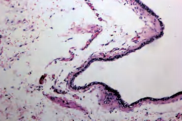 2.镜下 可见囊壁内衬假复层纤毛柱状上皮或复层鳞状上皮。纤维性囊壁内偶见甲状腺或黏液腺组织。合并感染者囊内可含脓性渗出物和坏死物,当囊肿穿破皮肤与外界相通时形成瘘管,也可与舌根部相通(图3-1)。