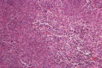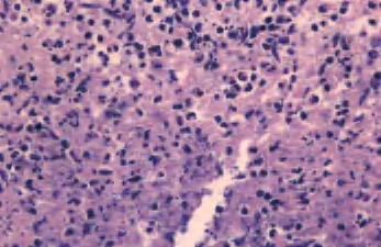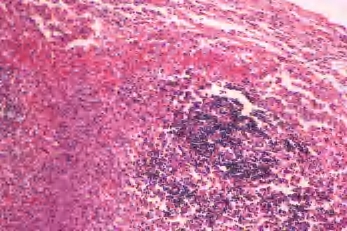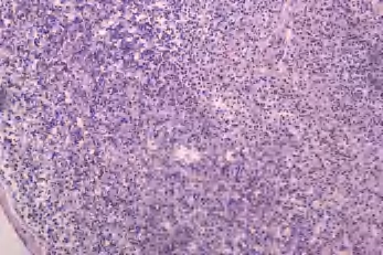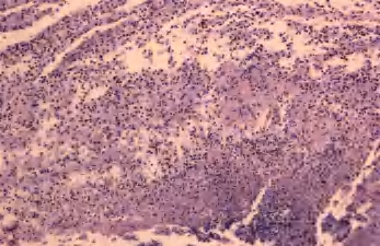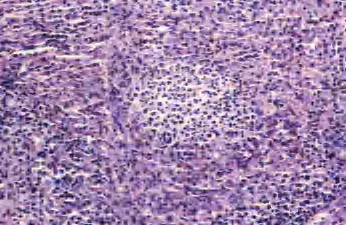 2.镜下 可见滤泡增生,生发中心扩大,含有大量核分裂像,窦组织细胞增生,窦内及实质内多数中性粒细胞浸润,可有坏死及脓肿形成。急性炎症慢性化后,则表现为滤泡、副皮质区及淋巴窦三者某一部分增生,炎细胞浸润减少并出现纤维化(图3-4、图3-5)。