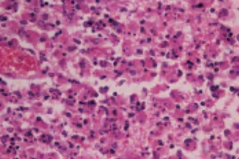 2.镜下 呈现一种特殊的肉芽肿性炎,其特点为:①肉芽肿形成呈“星芒状”“口唇样”或“裂隙样”,而不像结核的“地图样”;②肉芽肿的构造:中间为急性炎,周围为慢性炎,病变外区域呈非特异性炎。淋巴滤泡反应性增生,多灶性中性粒细胞浸润,并形成星形脓肿,脓肿周围由上皮样细胞栅栏状排列,可见郎罕巨细胞,形成典型的中心化脓性肉芽肿(图3-10至图3-12)。