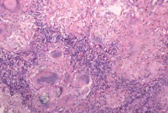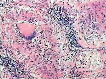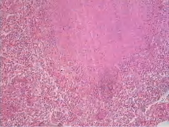 图3-13 淋巴结结核,中心大片红染无结构物质为干酪样坏死