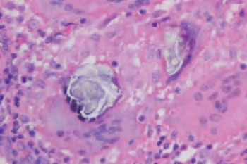 Schaumann小体最大径20~50μm,存在于巨细胞内或组织间隙,嗜苏木素着色,组织化学显示其中含铁或钙;星状体大小5~35μm,为蜘蛛状放射形结构,中央为2~4μm的核心,从此核心针状刺向周围放射。此两种小体是非诊断特异性的(图3-15至图3-17)。