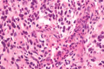 表现为显著的滤泡增生,伴有广泛大量浆细胞浸润及小灶上皮样组织细胞,包膜及小梁纤维性增厚并伴有淋巴结周围炎,细小动、静脉炎常存在(图3-18、图3-19)。