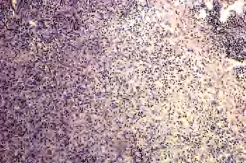 3.鉴别诊断 容易误诊,因混杂有大核的免疫母细胞和浆样单核细胞需与外周T细胞淋巴瘤结核鉴别;另一方面因为大片的凝固性坏死易误诊为结核。