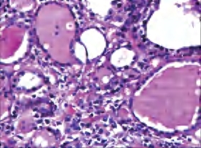 2.镜下 甲状腺部分滤泡破坏,溢出的胶质周围有组织细胞和多核巨细胞包绕,形成肉芽肿,但无干酪样坏死。间质可见多量嗜酸性粒细胞、淋巴细胞和浆细胞浸润。愈合期表现为滤泡上皮再生、间质纤维化及瘢痕形成(图3-27、图3-28)。
