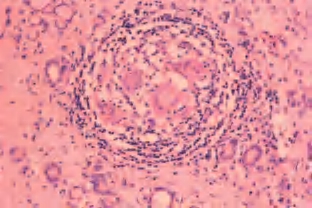 图3-28 亚急性肉芽肿性甲状腺炎,残留胶质周围有多核巨细胞围绕、炎细胞浸润形成的肉芽肿