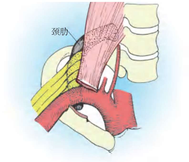 (3)将臂丛神经向外上牵拉,将锁骨下动脉向内下牵拉,即可显露颈肋或纤维束带(图2-14)。