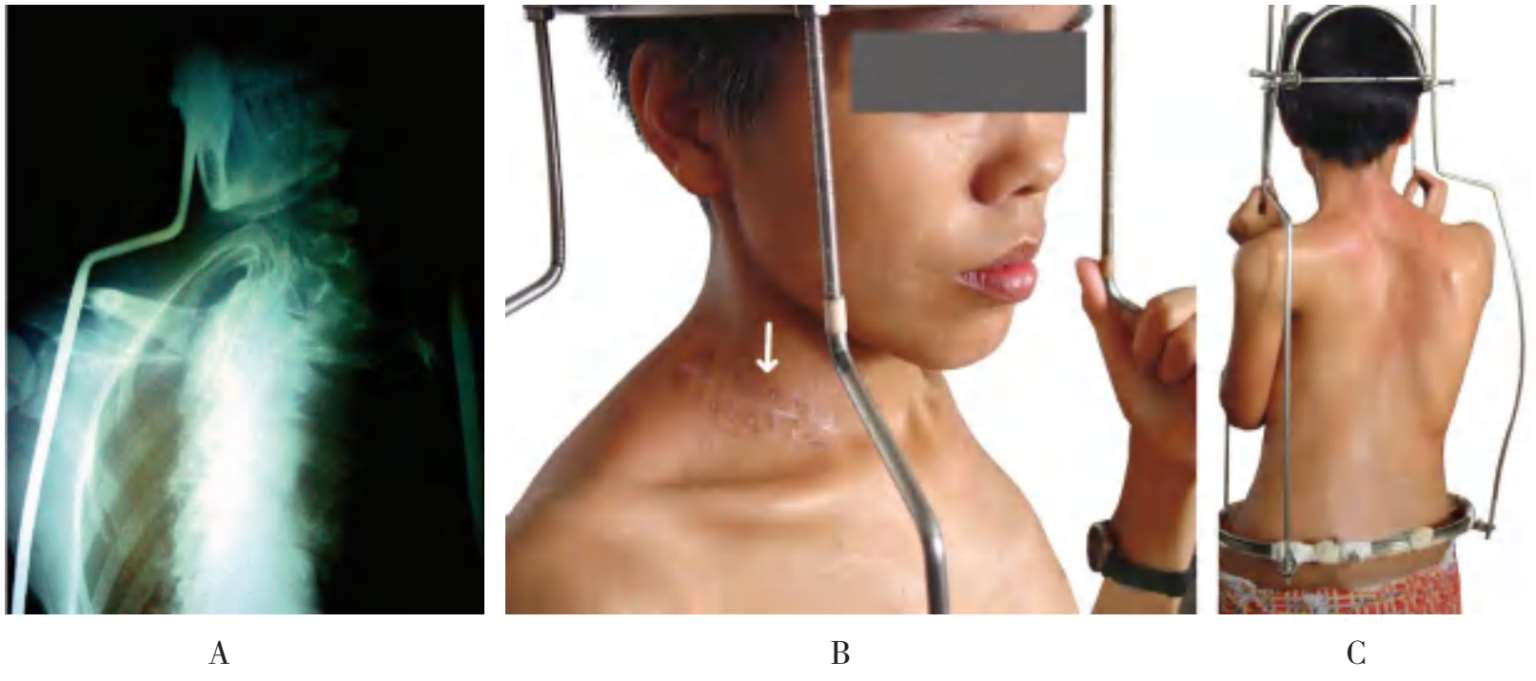 A.经头盆环牵引后,右侧第一肋骨升高并发胸廓出口综合征;B.箭头示锁骨上切口(切除了第一肋骨);C.第一肋骨切除后症状消失,继续进行头盆环牵引