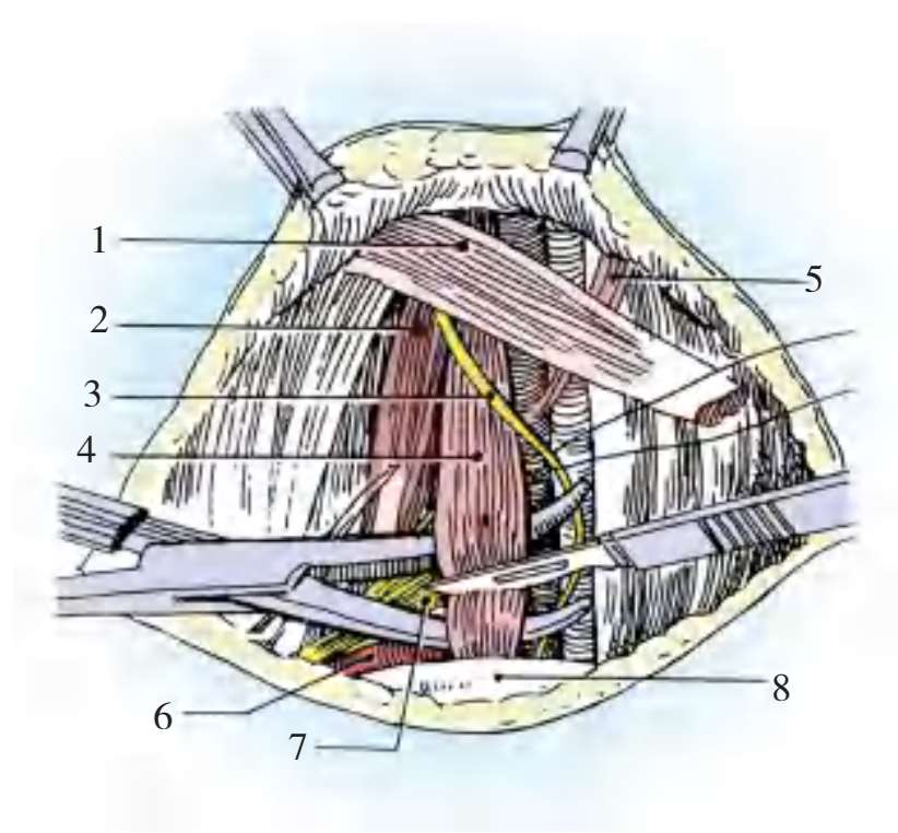 1.胸锁乳头肌;2.中斜角肌;3.膈神经;4.前斜角肌;5.肩胛舌骨肌;6.锁骨下动脉;7.臂丛神经;8.锁骨